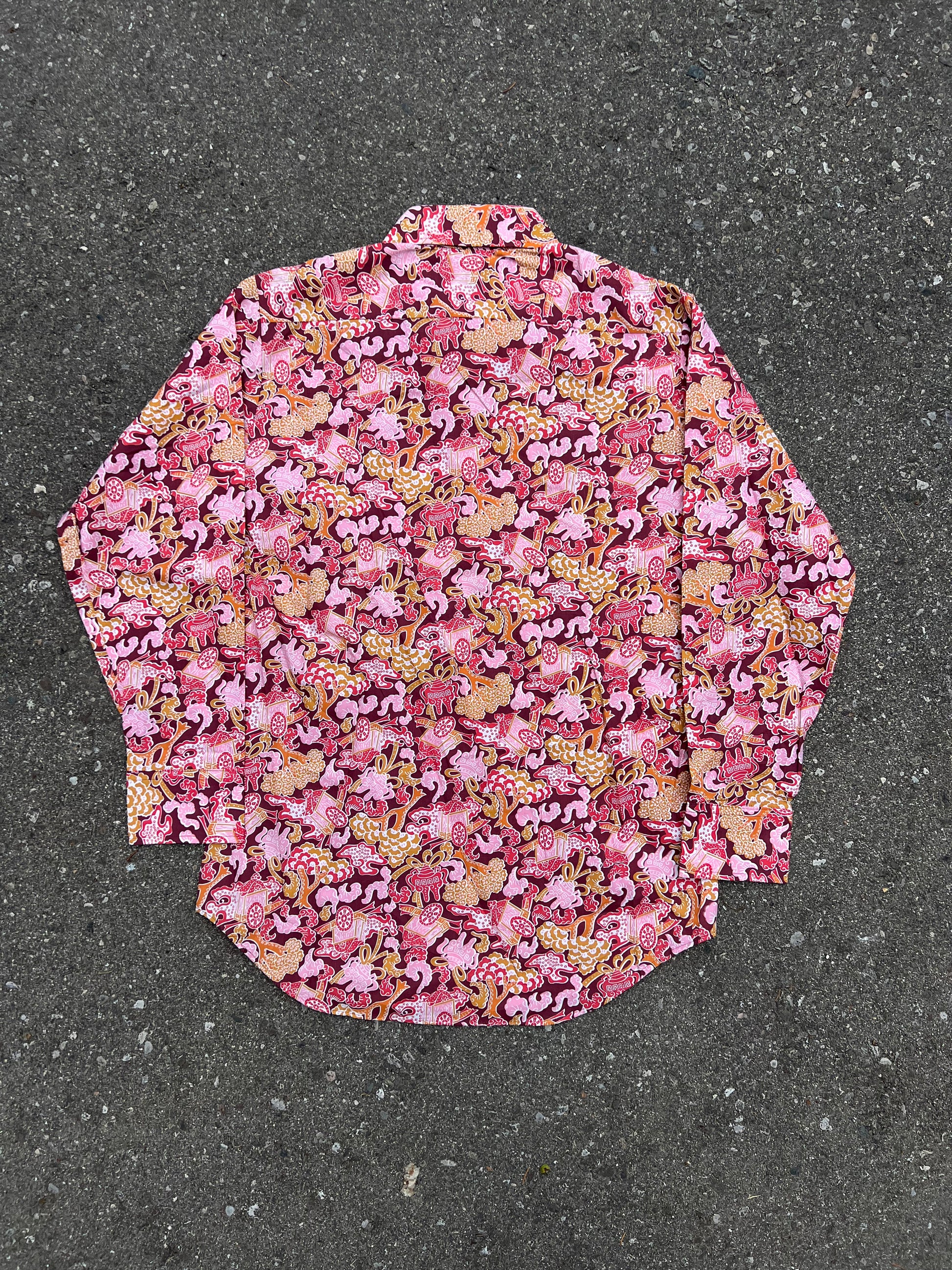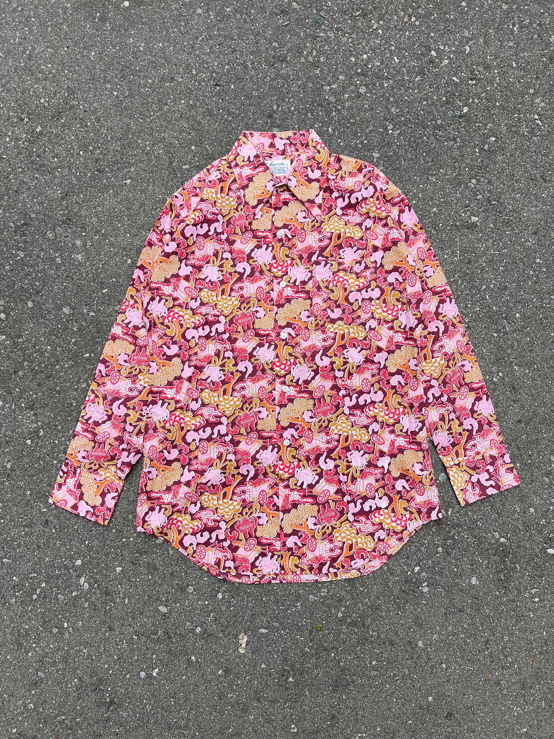 Imperator brand patterned button up shirt from the 1960's, made in Japan. Pattern throughout the entire shirt, bright colours. Tagged size M, fits bigger, more like size L. 10/10 condition, unworn. 22x32