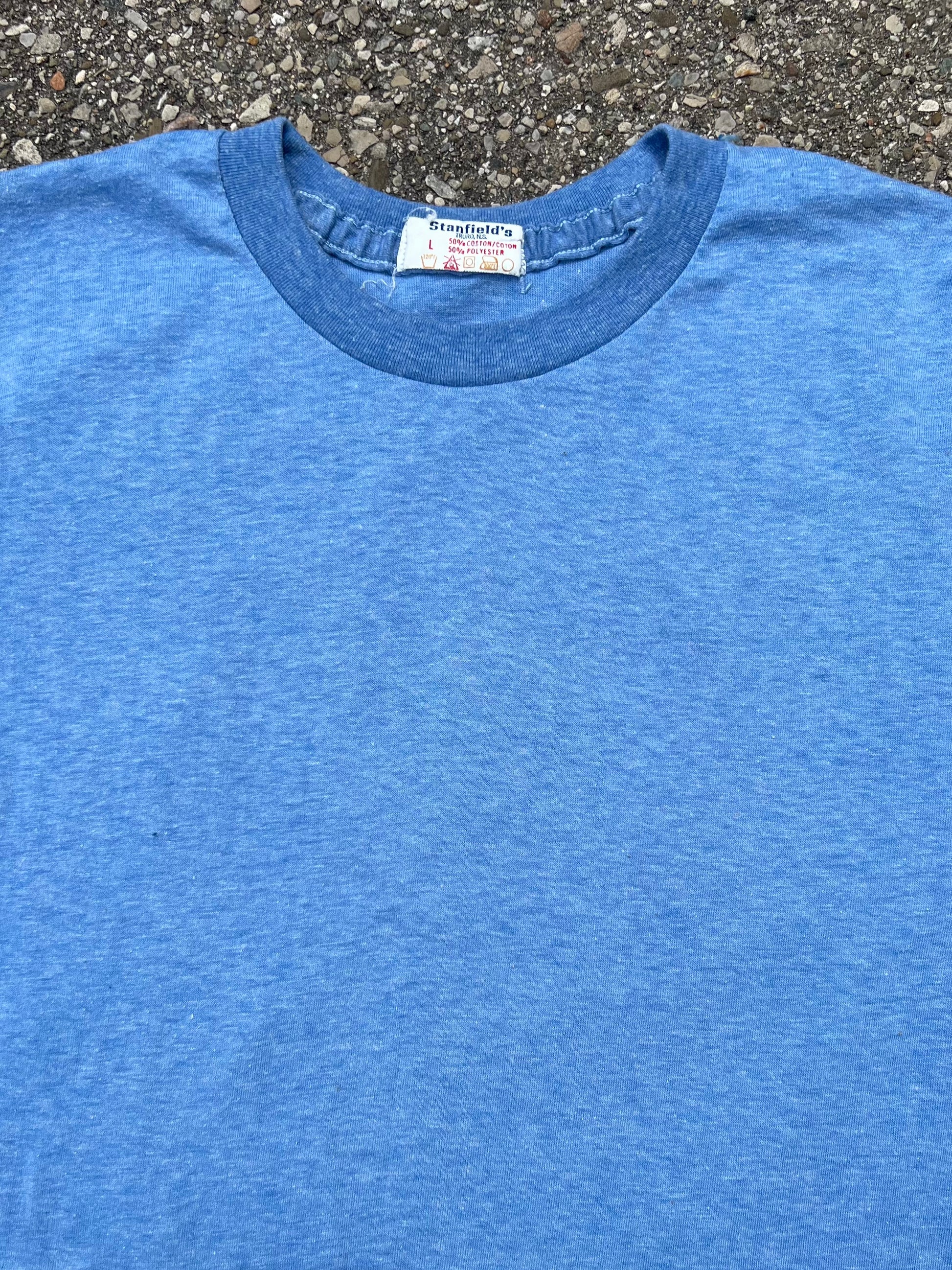 Heather blue blank t-shirt from the 1960's, made by the brand Stanfield's, made in Canada. Single stitch. Tagged size L, fits TTS, has a tighter fit. 9/10 condition, excellent condition. 19x28