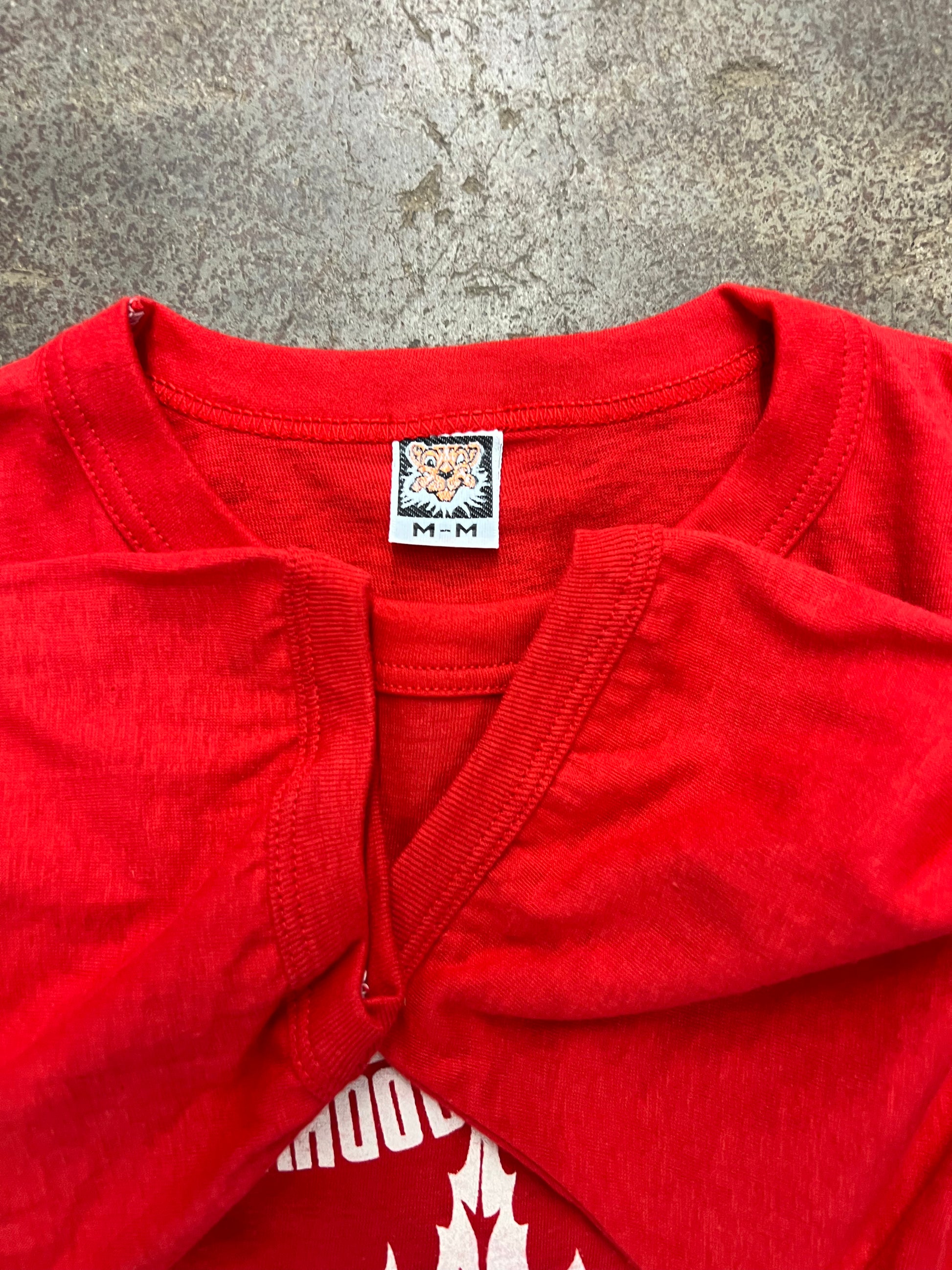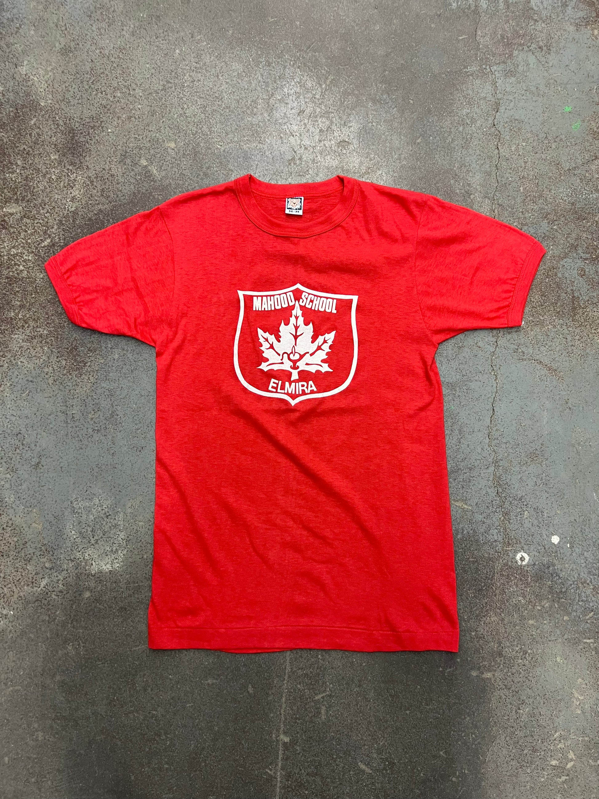 'Mahood School Elmira' graphic ringer t-shirt from the 1970's, printed on a Tiger brand t-shirt, made in Canada. Graphic on the front, ringer cuffs and collar. tagged size M, fits TTS, has a tighter fit. 9/10 condition, excellent condition. 17x28