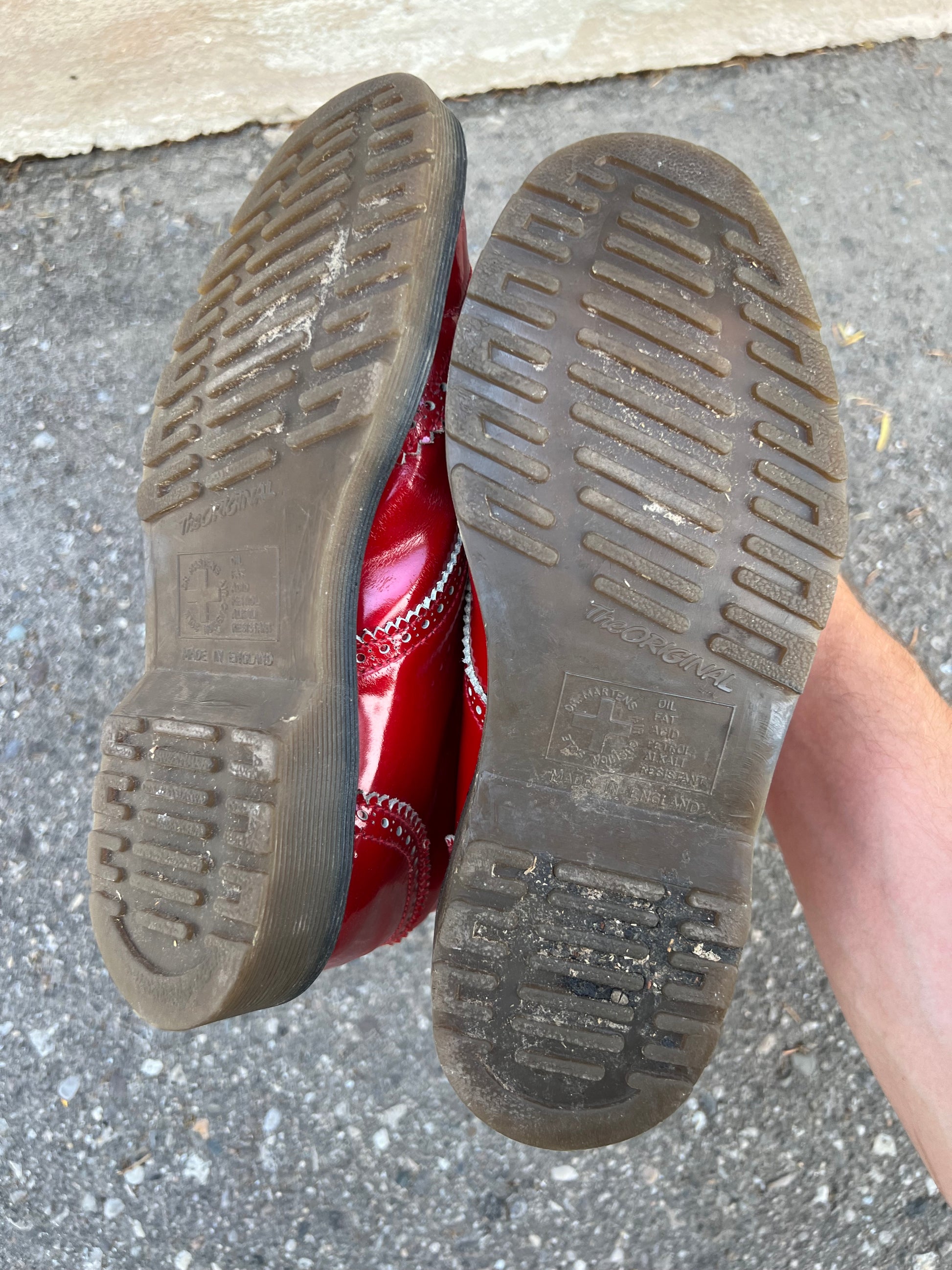 Doc Martens 5729 wingtip derby boots from the 1980's/1990's, made in England. Red patent leather material, great wingtip toe detailing. Women's size 5.5UK, 7.5US. 8/10 condition, some minor signs of wear, some scuffs throughout, overall great condition.