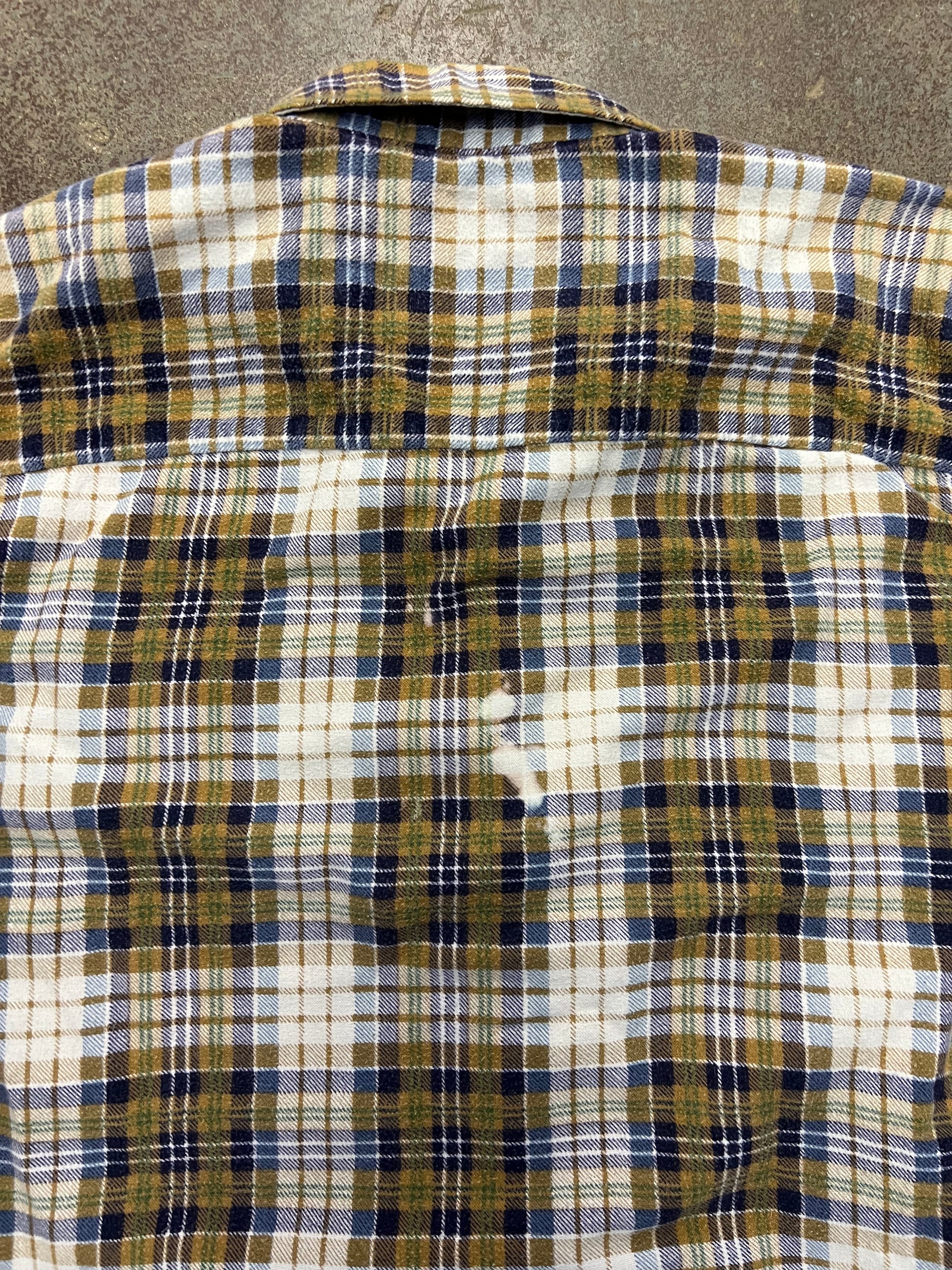 Sears Wearmaster printed plaid pattern cotton flannel shirt from the 1980's, made in China. Great printed plaid pattern throughout the entire shirt, soft cotton material. tagged size 16/16.5, fits size L best, has a boxy fit. 8/10 condition, small bleach mark on the back. 23.5x30