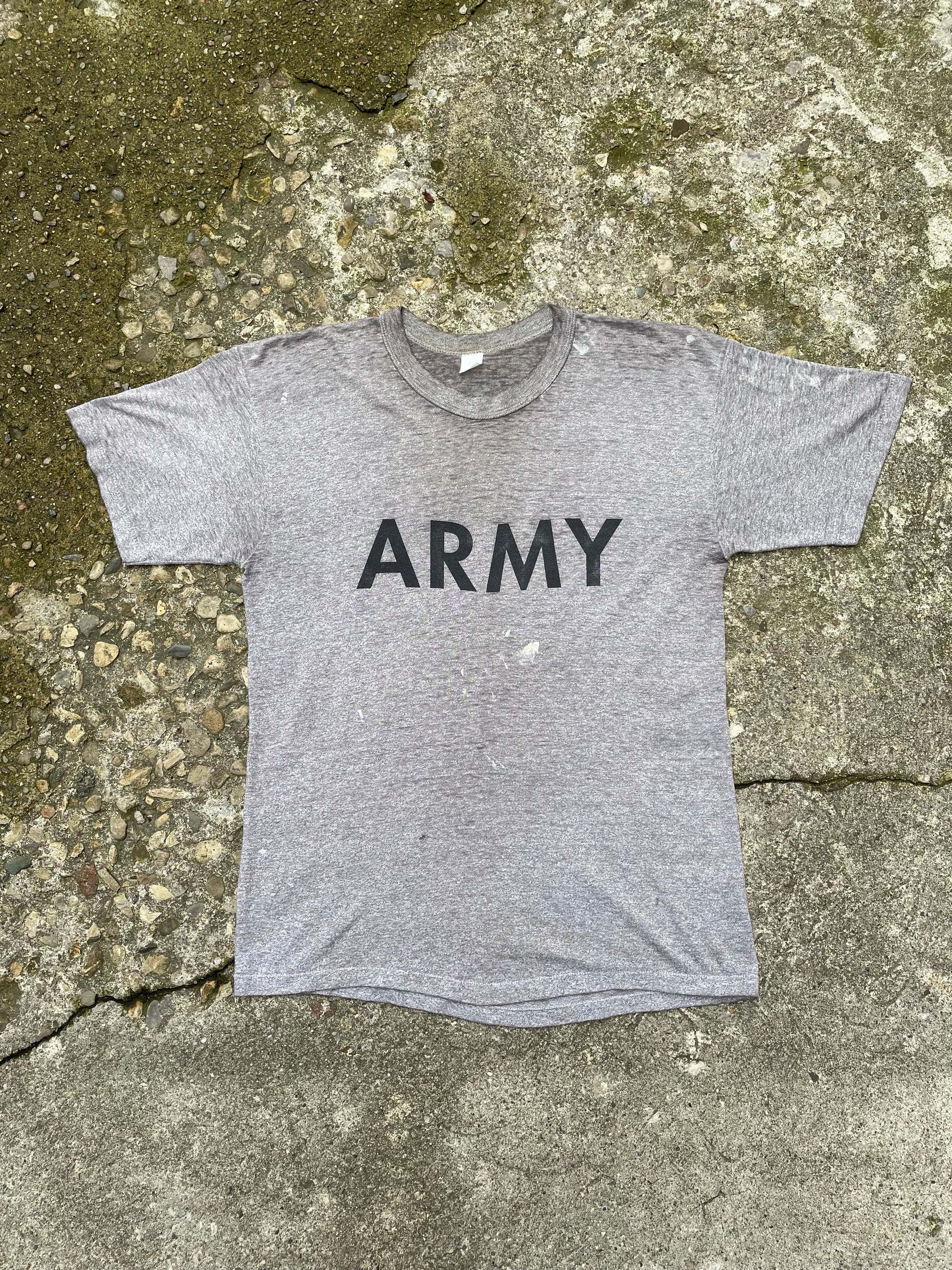 U.S. Army graphic t-shirt from the 1980's, made in the USA. Graphic across the front of the shirt, single stitch. Tag is faded, fits size L best, slightly boxy fit. 8/10 condition, paint marks throughout, shirt is soft and thin. 21.5x29