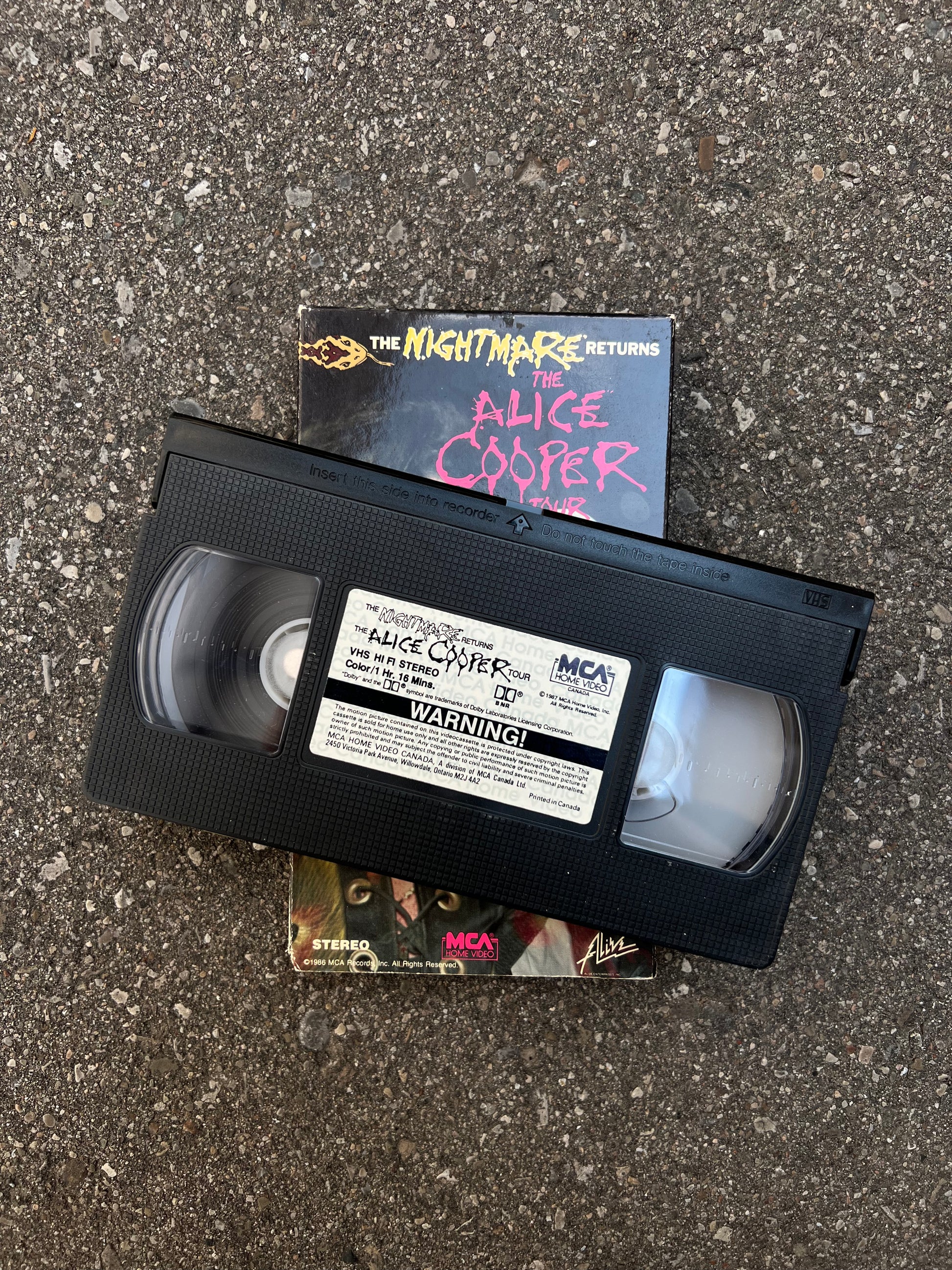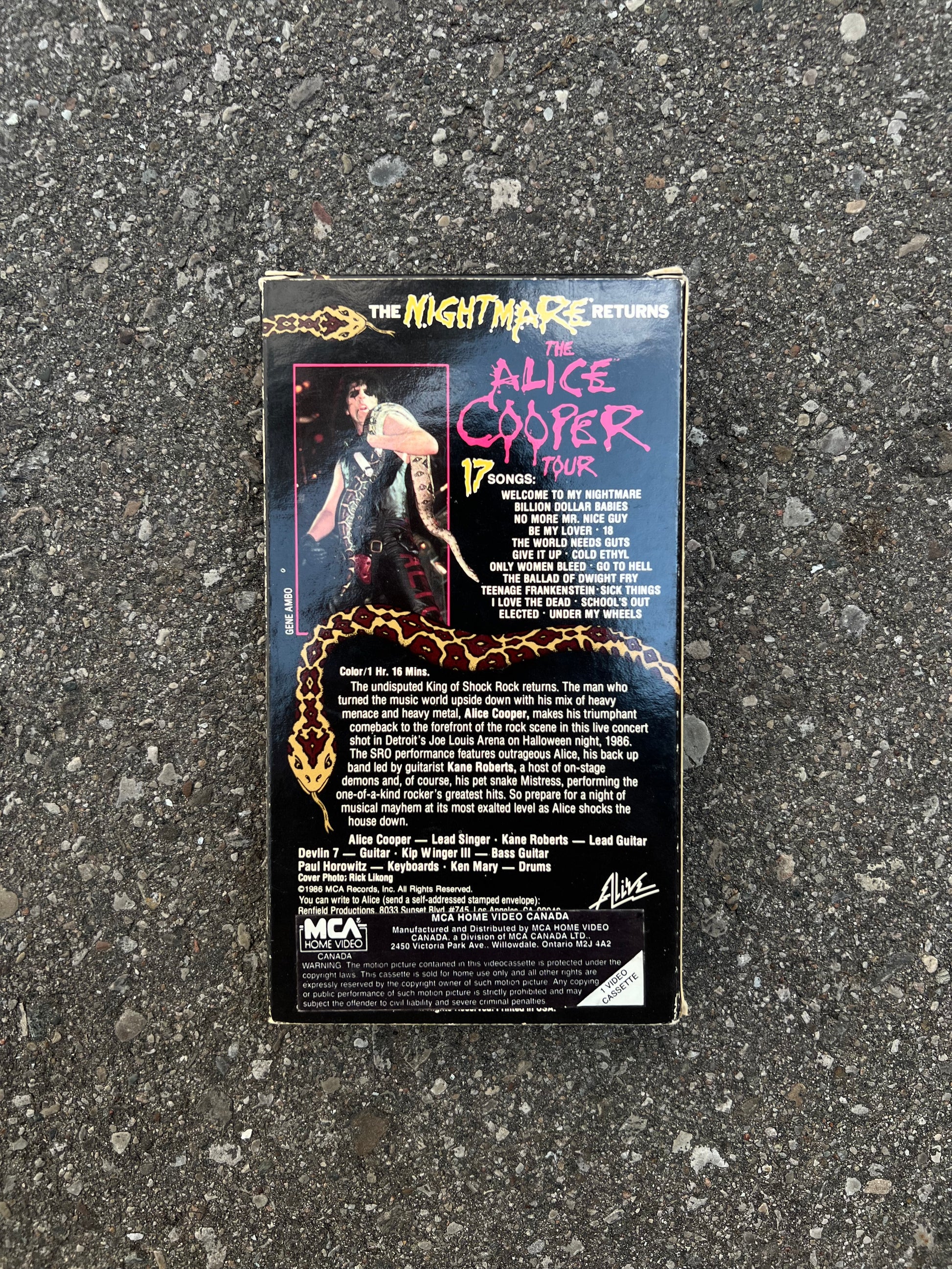 'The Nightmare Returns The Alice Cooper Tour VHS tape, released in 1986. Features live footage of Alice Cooper in Detroit on Halloween Night in 1986. Case and tape are both in great condition. Tested and working.