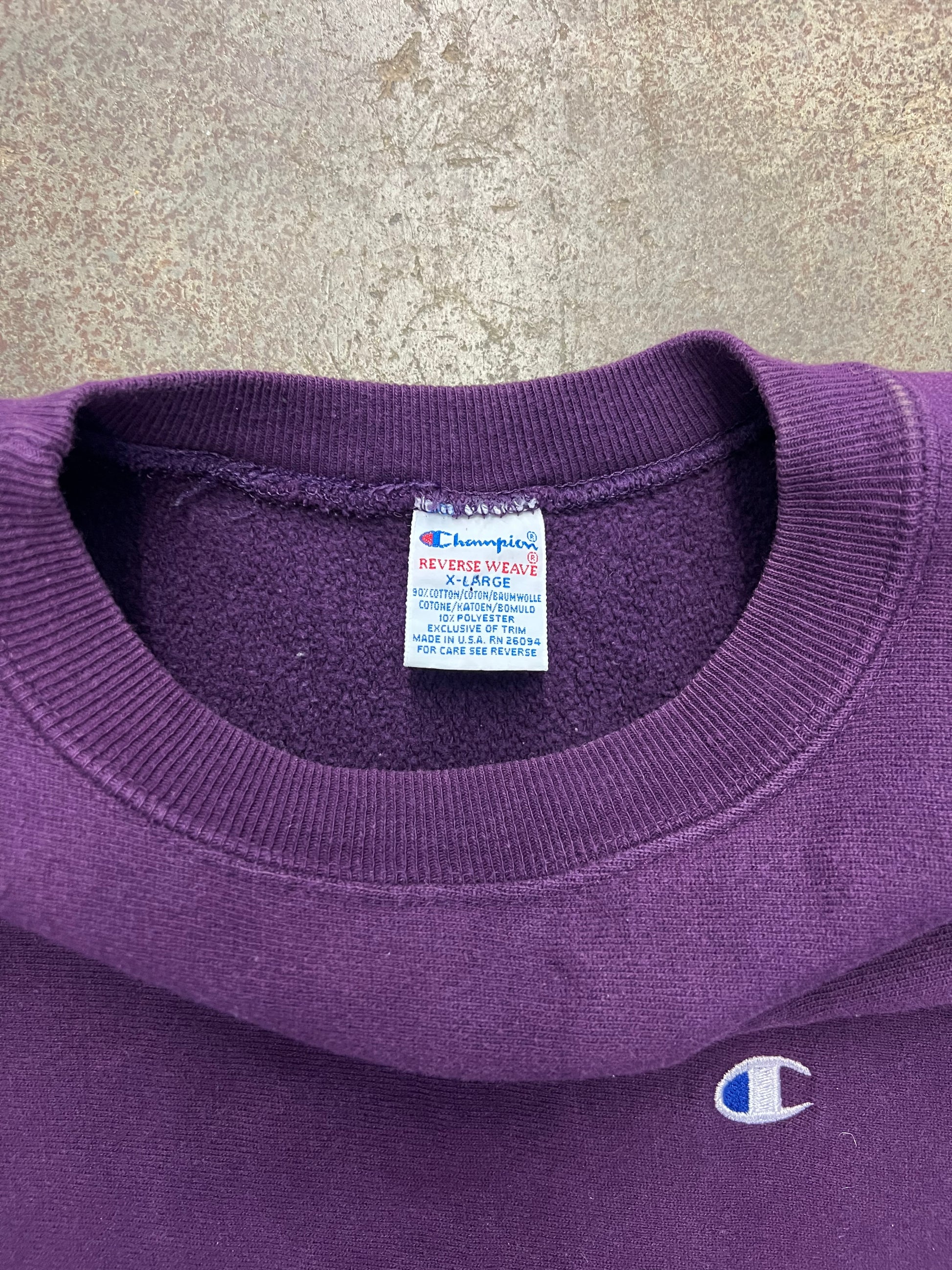 Champion reverse weave crewneck sweatshirt from the 1990's, made in the USA. Nice deep purple colourway. Embroidered logo on the front and sleeve, reverse weave ribbing on the sides of the sweatshirt. Tagged size XL, fits TTS. 8.5/10 condition, great condition. 24x30