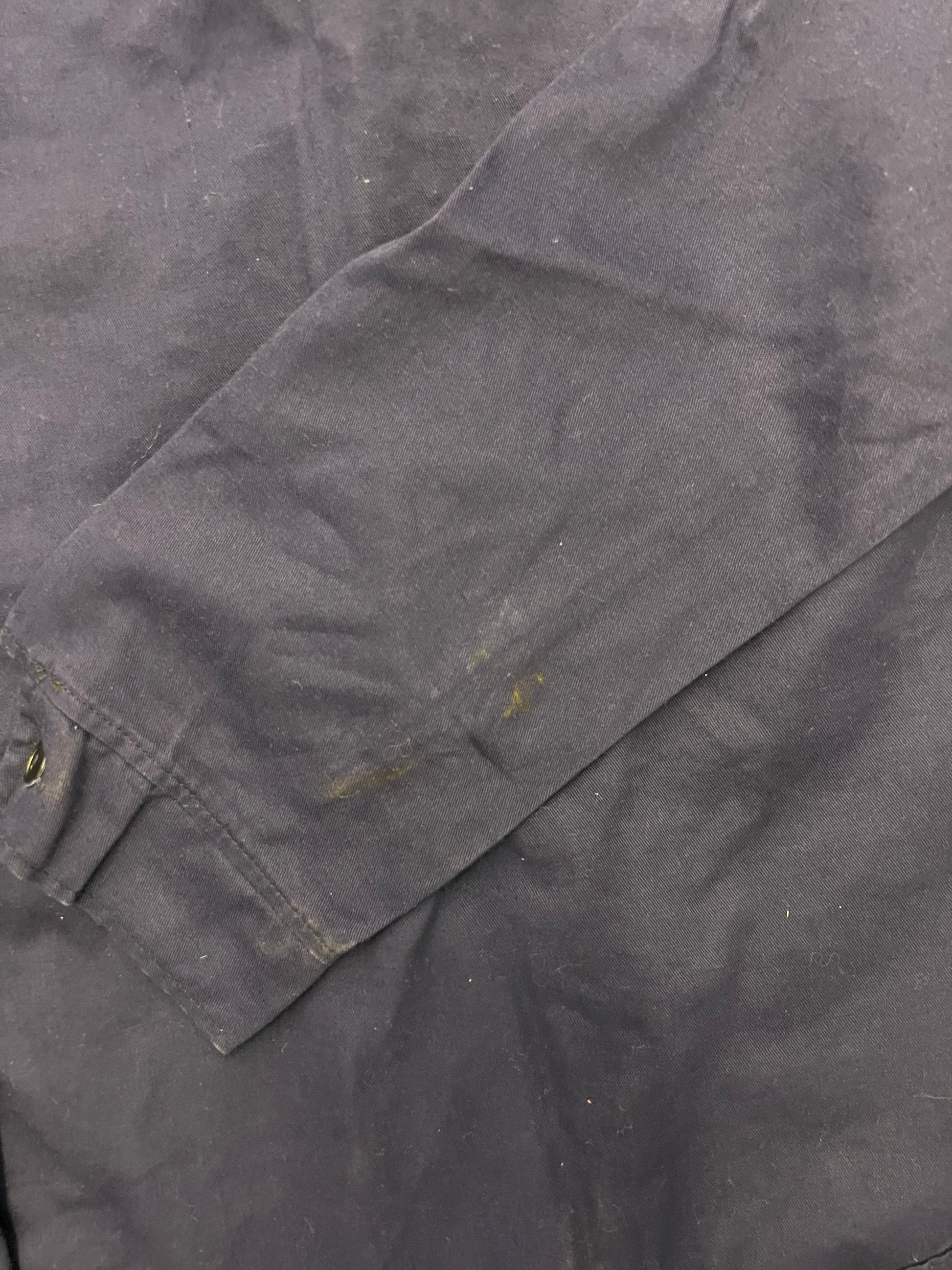 Cotton canvas work jacket from the 1990's, made by the brand International Sew-Right Company, made in Canada. Proban/FR-7A flame resistant cotton canvas material. 5 pocket front design. Tagged size 44, fits size XL best, has a boxy cropped fit. 8/10 condition, small mark on the sleeve. 25x28.5