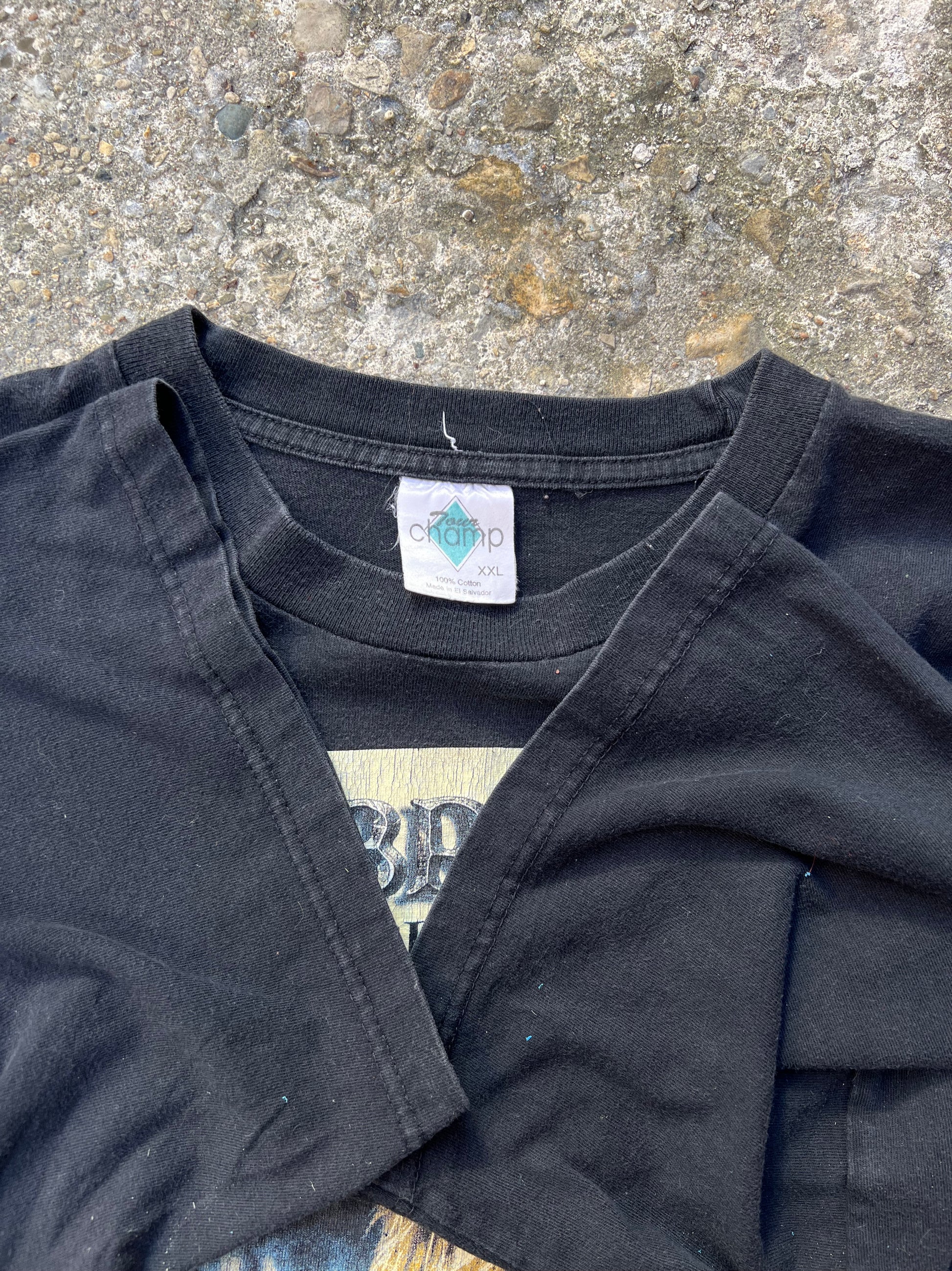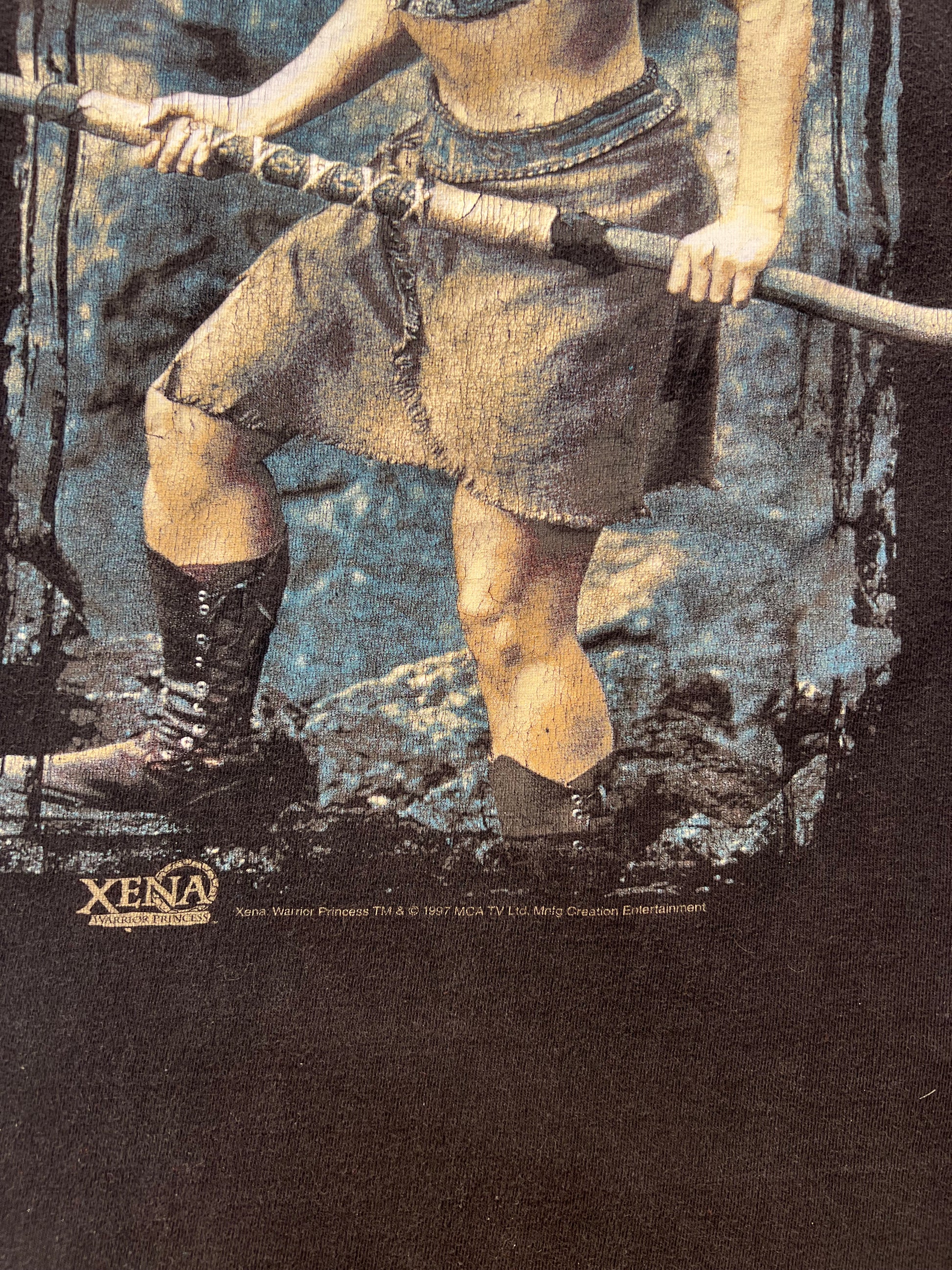 Gabrielle Bard of Poteidaia from Xena Princess Warrior graphic t-shirt, dated 1997, printed on a Tour Champ brand shirt. Big photo graphic on the front of the shirt. Tagged size XXL, fits TTS, has a boxy fit. 8.5/10 condition, minor fading throughout, some cracking on the graphic. 27x30