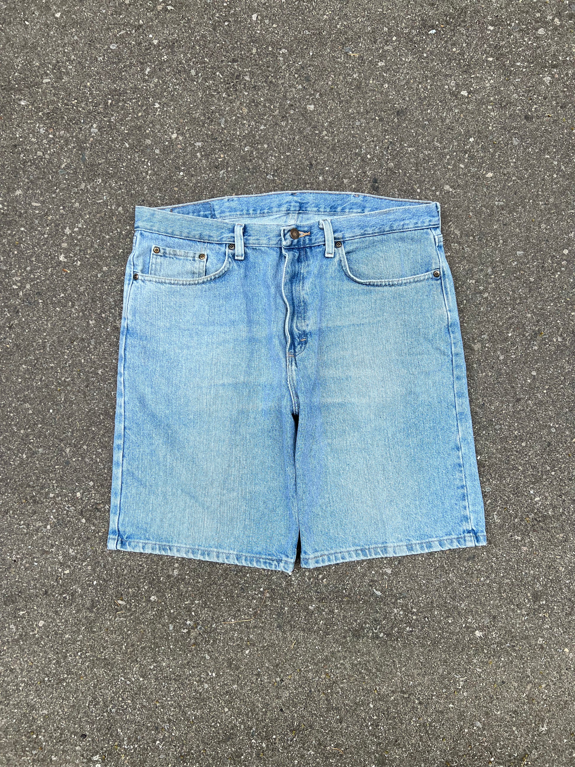 Wrangler light wash denim jean shorts from the 2000's, made in Mexico/USA. Relaxed fit, looser, slightly baggy fit. 36" waist, 10" inseam. 8.5/10 condition, great condition. 36x10